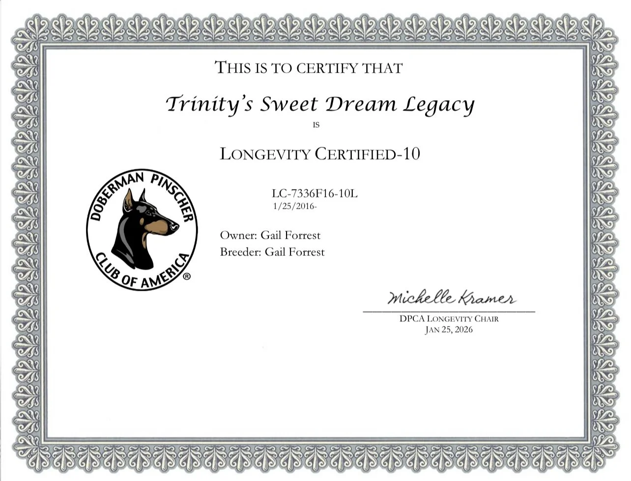 Sweet, loving Legacy came to our home on February 17th of 2018. Leased from our friend and mentor, Gail Forrest of Trinity Dobermans, Legacy brings the culmination of Gail's forty plus years of Doberman breeding and experience, along with Gail's incredible bloodline LOADED with LC (Longevity) and BL (Bred for Longevity) Certificates to our lines, kennel and our goals... helping us tremendously with our promise to protect and preserve our beloved breed through select breeding practices.